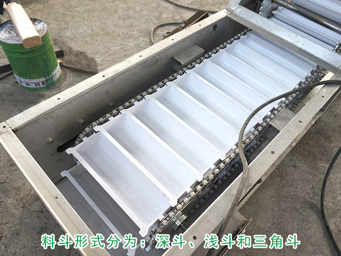 三角形料斗:深斗是具有导向侧边的三角形料斗,这种料斗在提升机中采用一个接一个的密集布置,当绕过上链轮卸料时,前一个料斗的两导向侧边和前壁形成后一个料斗的卸载导槽,这种料斗适于输送较重的、半磨琢性的、磨琢性大的块状物料。
