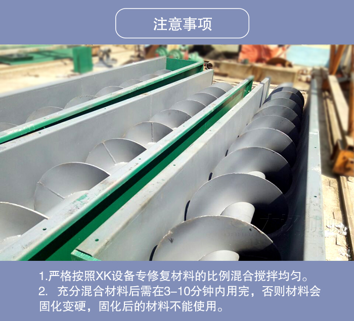 1.严格按照XK设备专修复材料的比例混合搅拌均匀。搅拌不均匀会出现局部不耐磨情况。