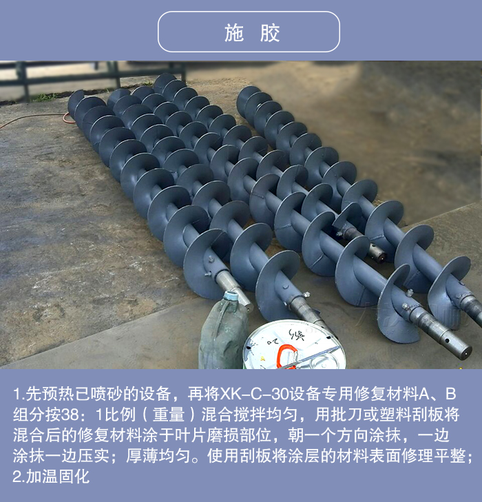 1.先预热已喷砂的设备,再将XK-C-30设备专用修复材料A、B组分按38:1比例(重量)混合搅拌均匀,用批刀或塑料刮板将混合后的修复材料涂于叶片磨损部位,朝一个方向涂抹,一边涂抹一边压实;厚薄均匀。使用刮板将涂层的材料表面修理平整;