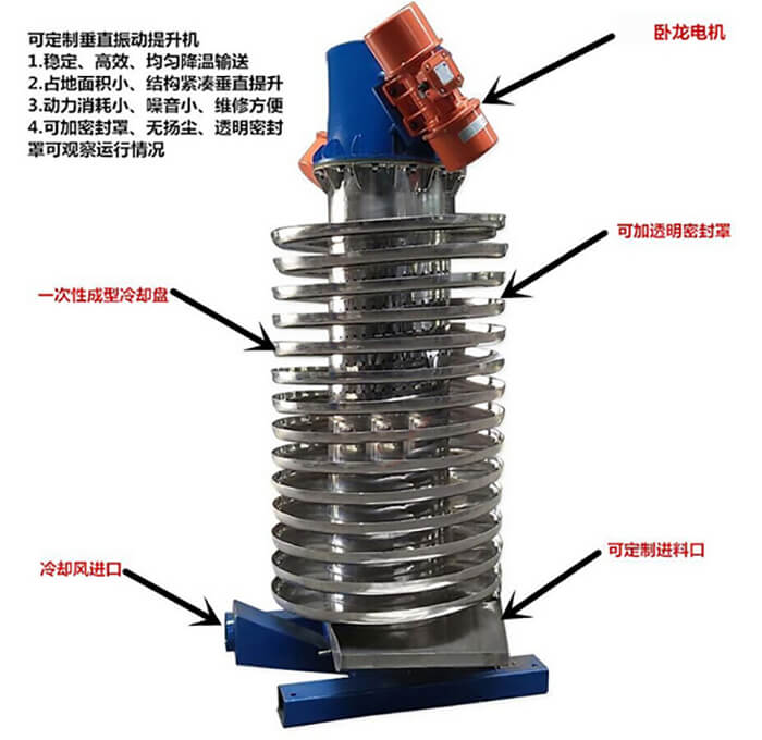 垂直振动螺旋提升机又叫振动螺旋提升机、垂直螺旋提升机、振动垂直提升机等。振动垂直螺旋提升机是一种新型的垂直振动输送设备,该设备具有蜂窝式底座,全新内管支撑系统本机对一切颗粒状、块状、粉状的固体物料都可以输送。