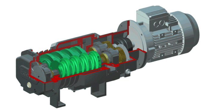 双轴午夜看片网站工作时,物料从进料口进入,两根螺旋轴相反方向转动时(一根左旋,一根右旋,可避免物料堵塞),物料在螺旋叶片的推力以及物料与叶片产生的摩擦力作用下,物料伴随螺旋叶片的向前推动而沿着料槽向前移动,直至出料口排出;在输送过程中,还同时可对物料进行搅拌和破碎。