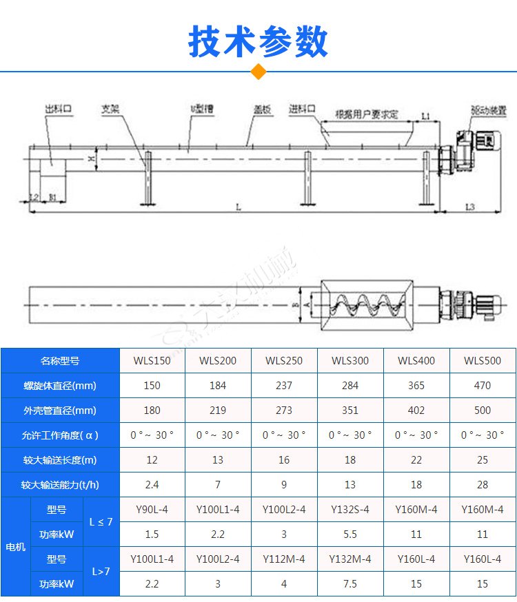 2、单台输送机的输送长度可达60米,输送量是相同直径有轴输送机的1.5倍。