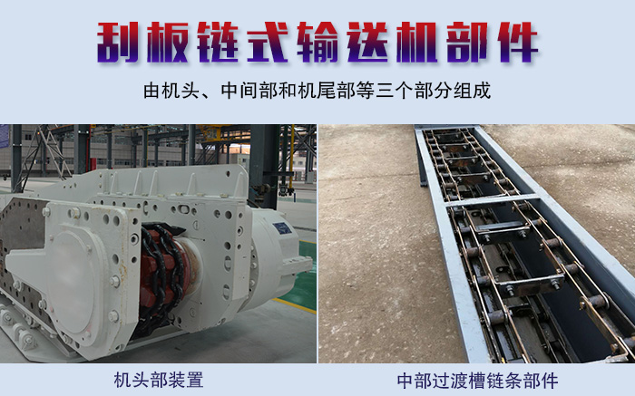 各种类型的刮板链式输送机的主要结构和组成的部件基本是相同的,它由机头、中间部和机尾部等三个部分组成。此外,还有供推移输送机用的液压千斤顶装置和紧链时用的紧链器等附属部件。机头部由机头架、电动机、液力偶合器、减速器及链轮等件组成。中部由过渡槽、中部槽、链条和刮板等件组成。机尾部是供刮板链返回的装置。重型刮板输送机的机尾与机头一样,也设有动力传动装置,从安设的位置来区分叫上机头与下机头。