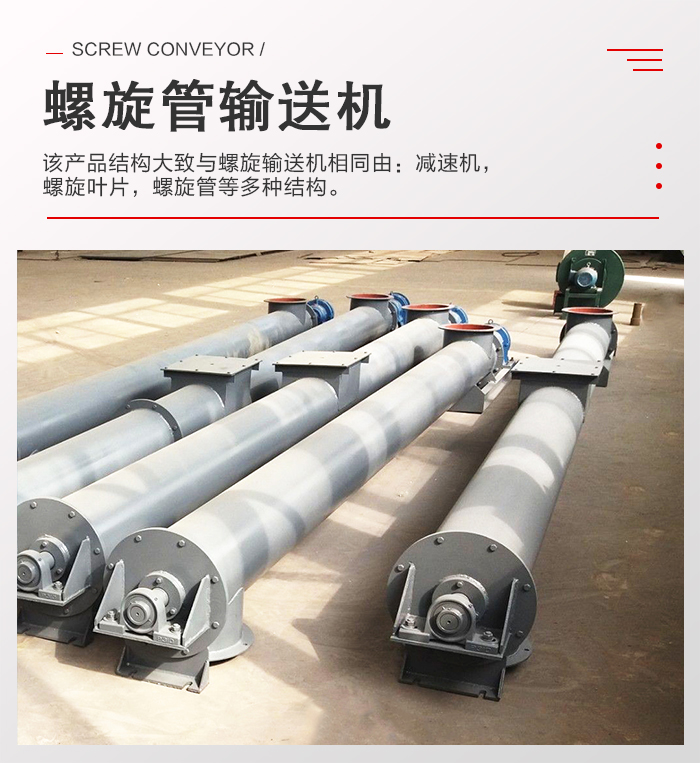 简介:螺旋管输送机该设备整体由圆管构成,所以很多人称之为螺旋管输送机。