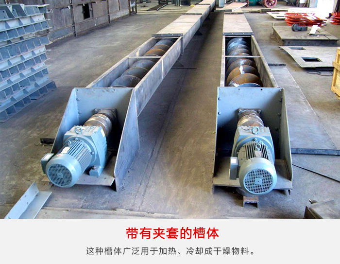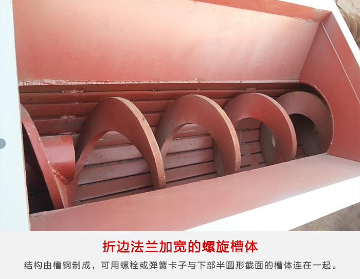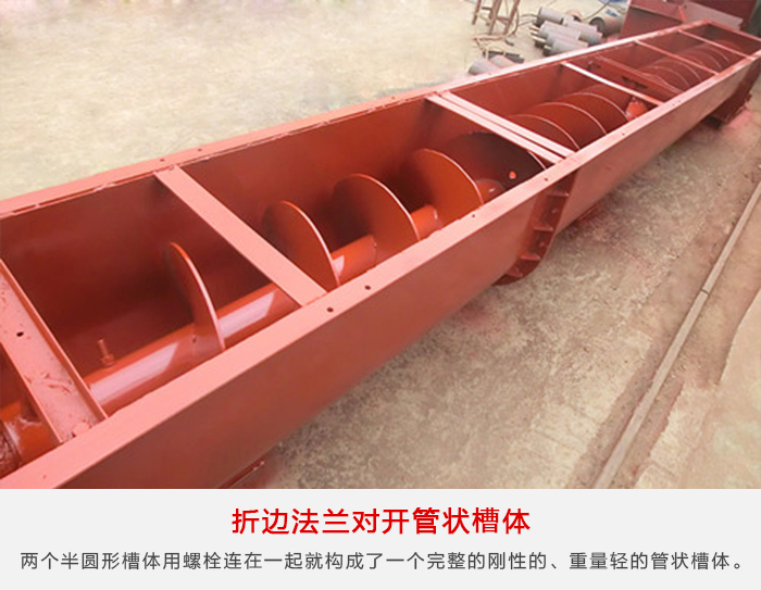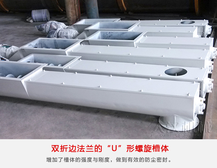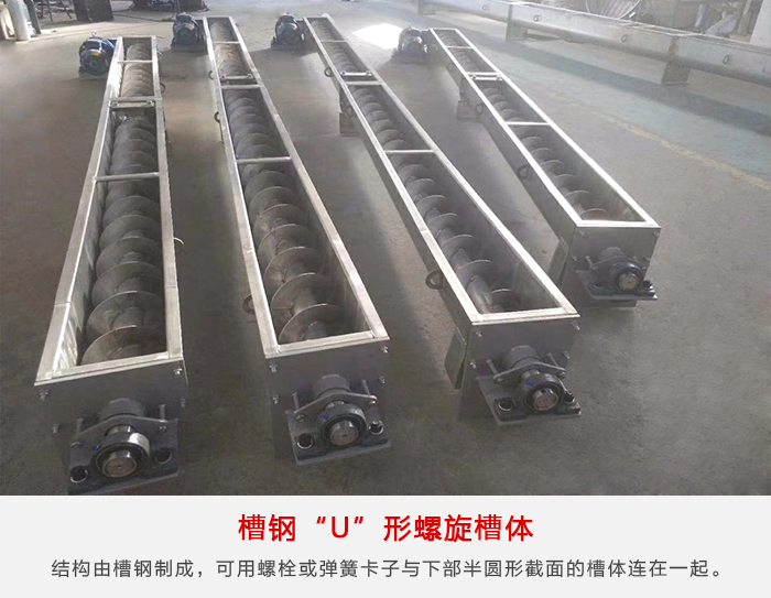 槽钢“U”形螺旋槽体适用于输送机支承间距要求长的场合。槽体的上边由结构槽钢制成,可用螺栓或弹簧卡子与下部半圆形截面的槽体连在一起。