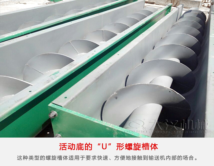 这种类型的螺旋槽体适用于要求快速、方便地接触到输送机内部的场合。活动底的U形螺旋槽体由上部刚性的槽钢与下部半圆形截面槽上体所构成,半圆形截面槽体的一边为铰接面,另一边则采用弹簧卡子夹紧或其他形式能快速打开的连接装置。