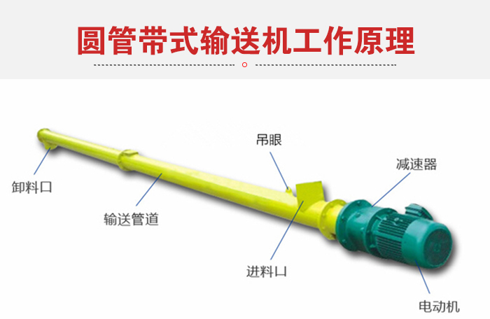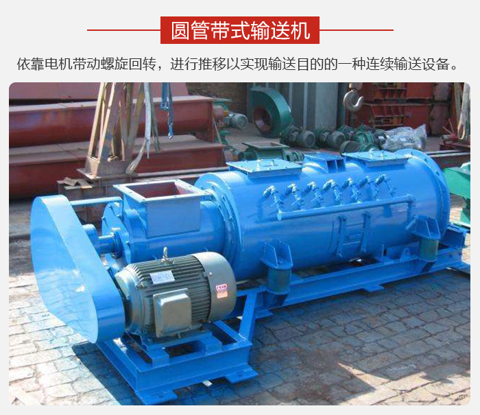 圆管带式输送机是依靠电机带动螺旋回转,对物料进行推移以实现输送目的的一种连续输送设备,可以水平、倾斜、垂直输送粉末、颗粒及小块状物料。具有结构简单、横截面积小、密封性好、操作方便、维修容易、便于封闭运输等优点。