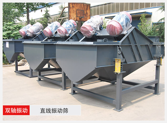 双轴振动筛是利用同步异向回转的双不平衡重激振,筛面水平或缓倾斜,筛箱的运动轨迹为直线。